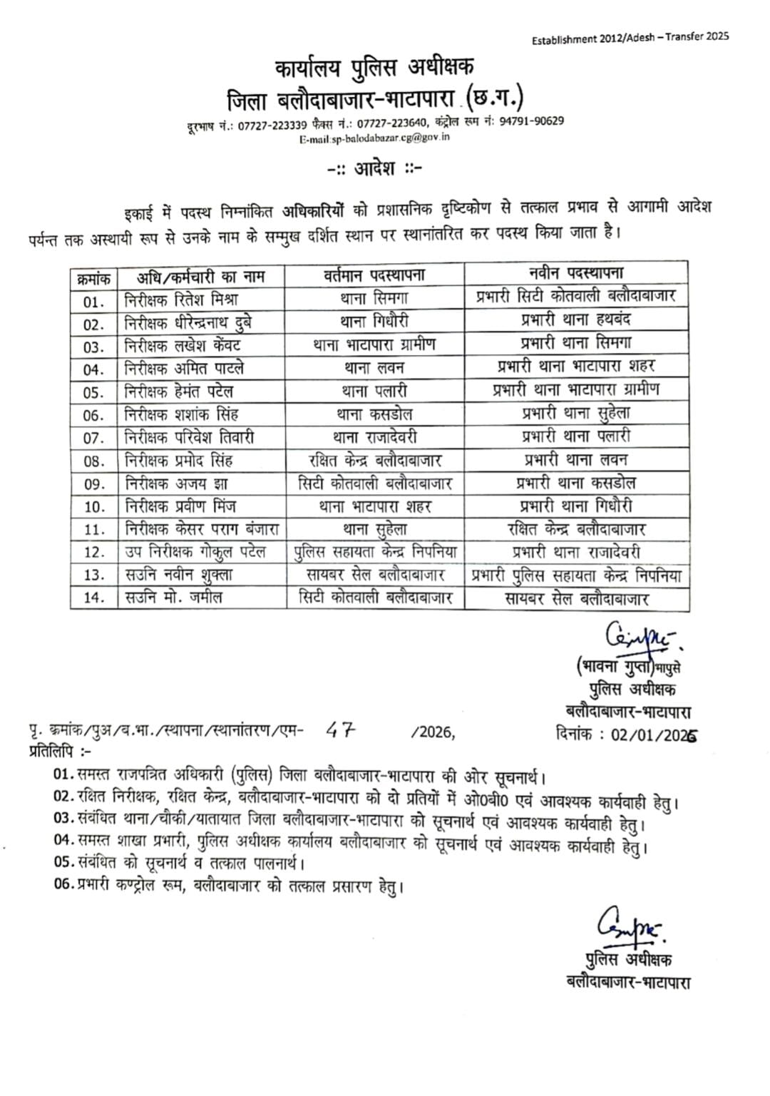 जिले में पुलिस प्रशासन को और अधिक चुस्त-दुरुस्त बनाने के उद्देश्य से व्यापक स्तर पर तबादला आदेश जारी किया गया है। पुलिस अधीक्षक श्रीमती भावना गुप्ता द्वारा जारी आदेश के अनुसार जिले के विभिन्न थानों में पदस्थ 14 निरीक्षक, उप निरीक्षक एवं सहायक उप निरीक्षकों को प्रशासनिक दृष्टिकोण से तत्काल प्रभाव से आगामी आदेश तक नवीन पदस्थापना दी गई है।