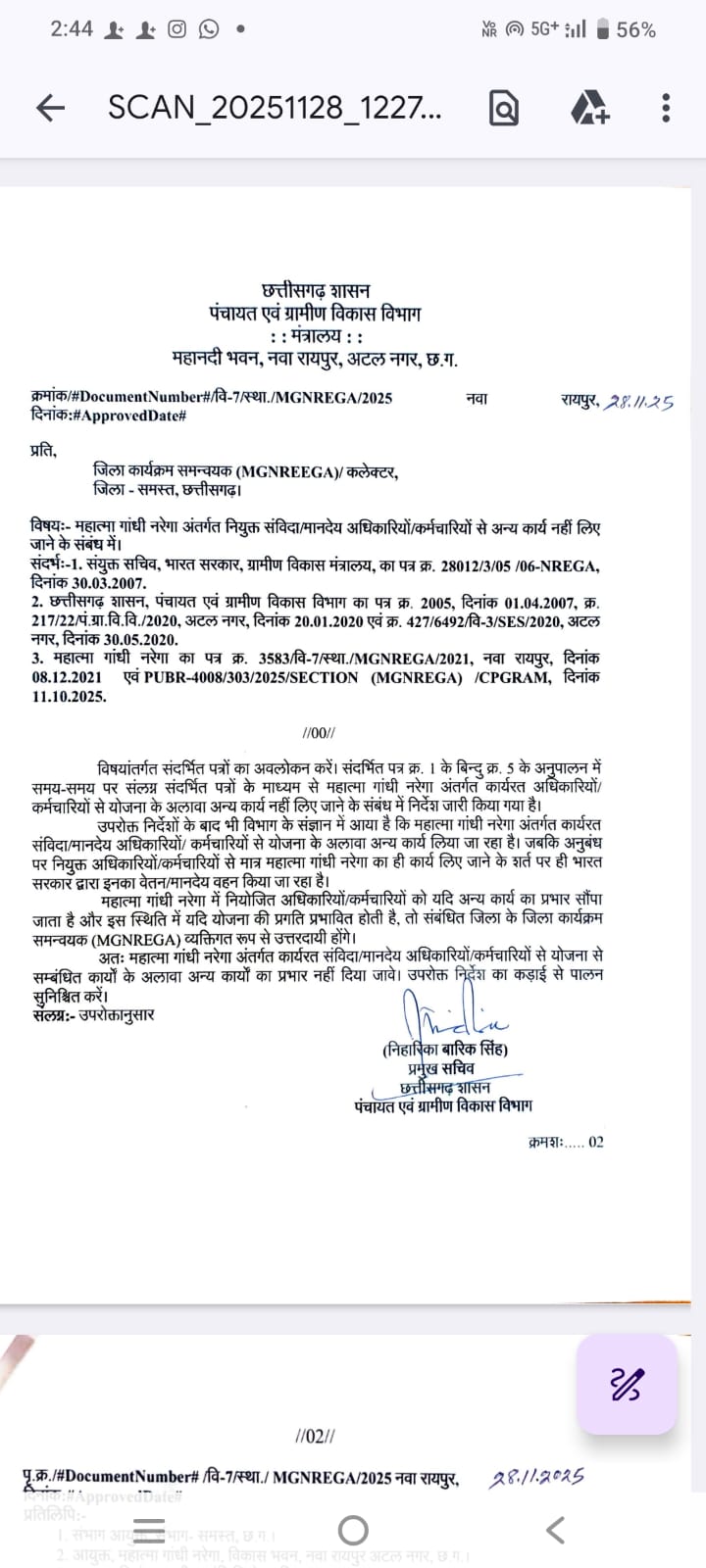 पंचायत एवं ग्रामीण विकास विभाग, मंत्रालय महानदी भवन, नवा रायपुर द्वारा पत्र क्रमांक वि-7/स्था./MGNREGA/2025 दिनांक 28.11.2025 के माध्यम से समस्त जिला कार्यक्रम समन्वयकों (कलेक्टरों) को स्पष्ट चेतावनी दी गई है कि यदि नरेगा कर्मियों को अन्य कार्य सौंपे जाते हैं और इससे योजना की प्रगति प्रभावित होती है, तो संबंधित जिला कार्यक्रम समन्वयक व्यक्तिगत रूप से उत्तरदायी होंगे।