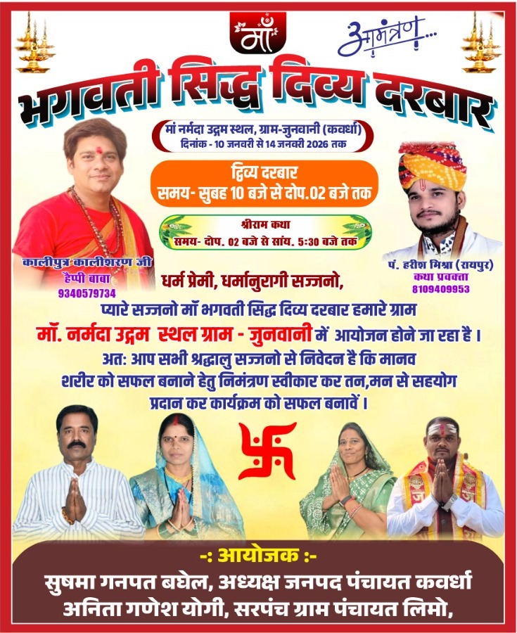 छत्तीसगढ़ की धार्मिक और आध्यात्मिक भूमि पर एक बार फिर श्रद्धा, भक्ति और सनातन संस्कृति का भव्य संगम होने जा रहा है। मां नर्मदा के पावन उद्गम स्थल ग्राम जुनवानी (कवर्धा) में भगवती सिद्ध दिव्य दरबार का आयोजन 10 जनवरी से 14 जनवरी 2026 तक अत्यंत श्रद्धा और भव्यता के साथ किया जा रहा है।