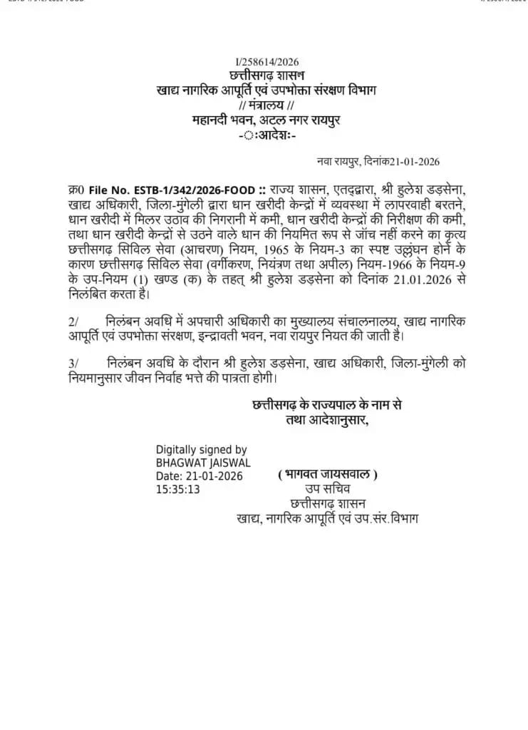 File No. ESTB-1/342/2026-FOOD के तहत जारी आदेश में उल्लेख किया गया है कि उक्त लापरवाही के चलते छत्तीसगढ़ सिविल सेवा (वर्गीकरण, नियंत्रण तथा अपील) नियम-1966 के अंतर्गत दंडात्मक कार्रवाई करते हुए निलंबन का निर्णय लिया गया है।