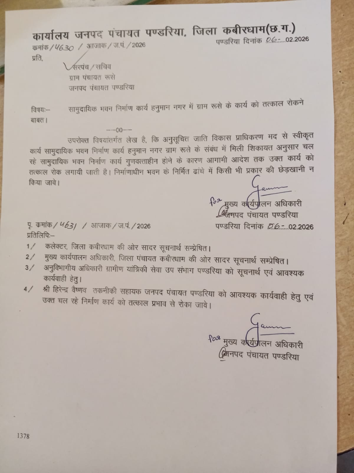 जिले के जनपद पंचायत पंडरिया अंतर्गत ग्राम पंचायत रूसे के हनुमान नगर में अनुसूचित जाति विकास प्राधिकरण मद से स्वीकृत सामुदायिक भवन निर्माण कार्य पर अचानक रोक लगा दी गई है। मुख्य कार्यपालन अधिकारी जनपद पंचायत पंडरिया द्वारा 06 फरवरी 2026 को जारी आदेश में शिकायत के आधार पर कार्य को “गुणवत्ताहीन” बताते हुए आगामी आदेश तक निर्माण कार्य तत्काल प्रभाव से रोकने के निर्देश दिए गए हैं।