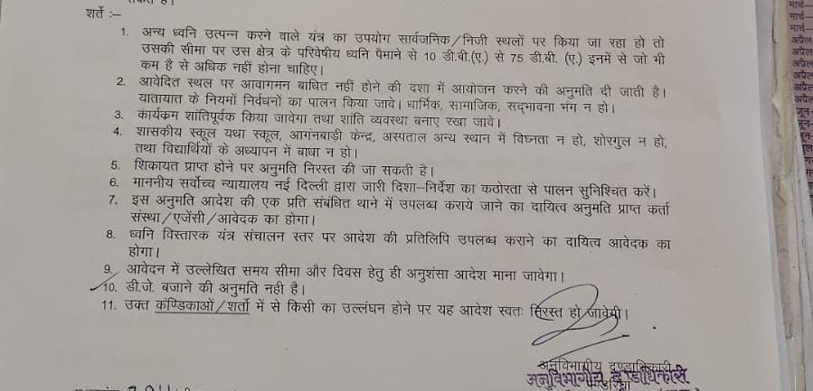 अनुविभागीय अधिकारी (राजस्व) बोडला ,पंडरिया ,कवर्धा , सहसपुर लोहारा द्वारा जारी अनुमति आदेश के कंडिका 10 में स्पष्ट रूप से डीजे बजाने की अनुमति नहीं दी गई है, इसके बावजूद क्षेत्र में खुलेआम डीजे की तेज आवाज गूंज रही है। प्रशासनिक आदेश की इस खुलेआम अवहेलना से यह सवाल उठने लगा है कि आखिर जिम्मेदार विभाग और अधिकारी इस पर कार्रवाई करने के बजाय मूकदर्शक क्यों बने हुए हैं।
