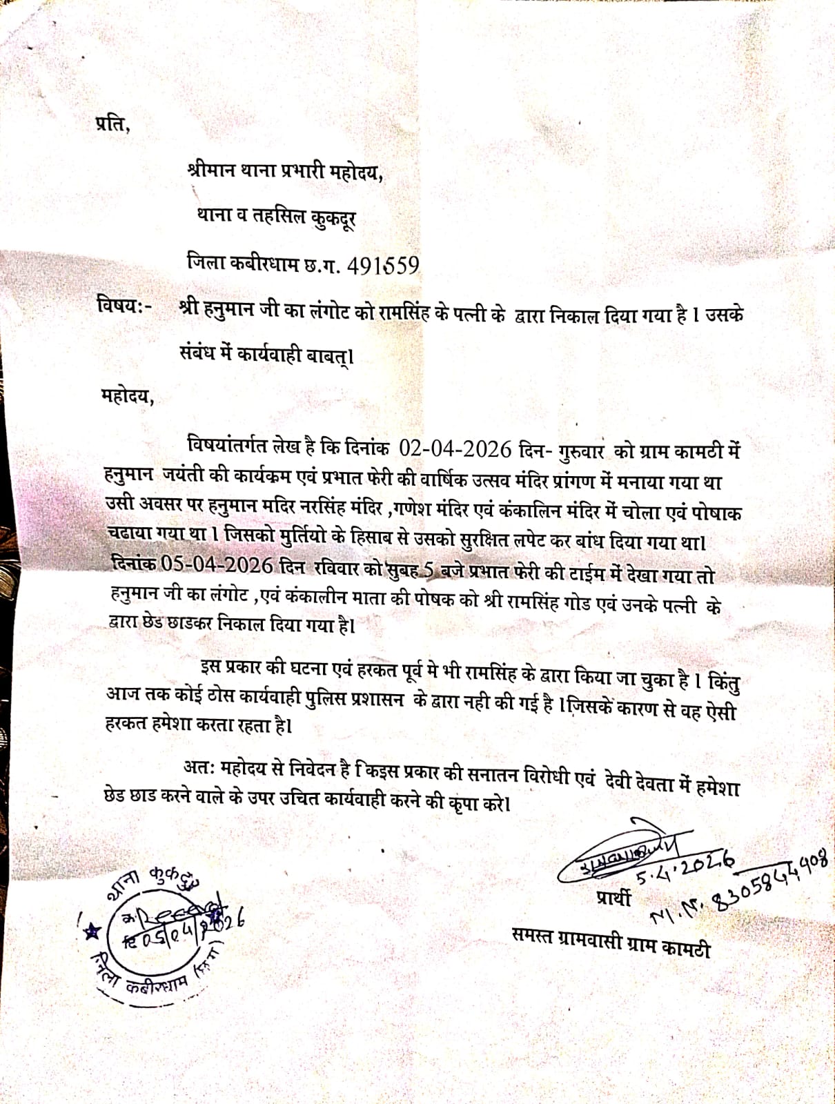 पंडरिया विधानसभा के थाना कुकदूर क्षेत्र अंतर्गत ग्राम कामठी में धार्मिक आस्था से जुड़ा एक संवेदनशील मामला सामने आने के बाद गांव का माहौल गरमा गया है। सोशल मीडिया पर वायरल एक कथित सीसीटीवी वीडियो के आधार पर आरोप लगाए जा रहे हैं कि हनुमान जयंती पर भगवान हनुमान को अर्पित किए गए चोला और लागोट के साथ छेड़छाड़ की गई। हालांकि, पूरे प्रकरण की आधिकारिक पुष्टि अभी जांच के बाद ही संभव होगी।