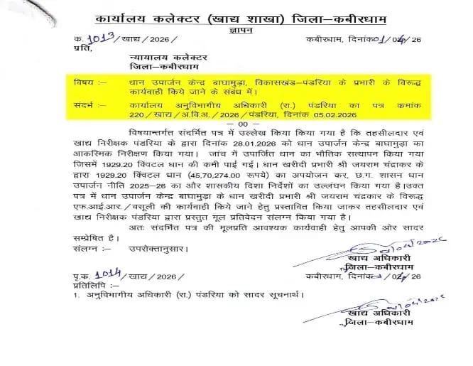 दस्तावेजों के मुताबिक बाघामुड़ा केंद्र के खरीदी प्रभारी जयराम चंद्राकर के खिलाफ एफआईआर और वसूली की कार्रवाई के निर्देश दिए गए हैं। लेकिन क्या 1929 क्विंटल धान की कमी केवल एक प्रभारी की लापरवाही से संभव है। खरीदी केंद्रों की दैनिक एंट्री, स्टॉक रजिस्टर, ऑनलाइन पोर्टल अपलोड, परिवहन पर्ची और गोदाम सत्यापन—इन सभी स्तरों पर हस्ताक्षर और अनुमोदन होते हैं। यदि कमी इतनी बड़ी है, तो जवाबदेही भी बहुस्तरीय होनी चाहिए।